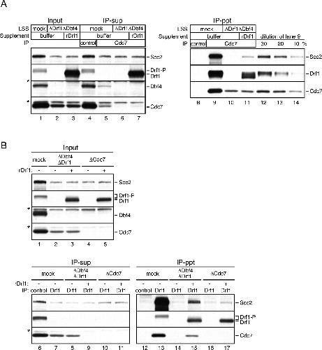 Figure 5. The Cdc7âkinase complex, but not free Cdc7, associates with Scc2. (A) LSS was depleted with either control (lanes 1,4,5,8,9) or a mixture of Drf1 and Dbf4 antibodies (lanes 2,3,6,7,10,11), and then supplemented with either buffer (lanes 1,2,4â6,8â10), or recombinant Drf1 (100 nM final concentration; lanes 3,7,11). IP from the resulting LSS extracts was performed with control (lanes 4,8) or Cdc7 antibody (lanes 5â7,9â11). Input (lanes 1â3), supernatants (IP-sup; lanes 4â7), immunoprecipitates (IP-ppt; lanes 8â11), and a serial dilution of the sample in lane 9 were probed with the indicated antibodies. (*) Cross-reacting band. (B) LSS was depleted with control antibody (lanes 1,6,7,12,13), a mixture of Drf1 and Dbf4 antibodies (lanes 2,3,8,9,14,15), or Cdc7-antibody (lanes 4,5,10,11,16,17), and then supplemented with either buffer (lanes 1,2,4,6â8,10,12â14,16) or 20 nM rDrf1 (lanes 3,5,9,11,15,17). IP from the resulting LSS was performed with control (lanes 6,12) or anti-Drf1 antibody (lanes 7â11,13â17). Input (lanes 1â5), supernatants (IP-sup; lanes 6â11), and immunoprecipitates (IP-ppt; lanes 12â17) were probed with the indicated antibodies. (*) Cross-reacting band. |