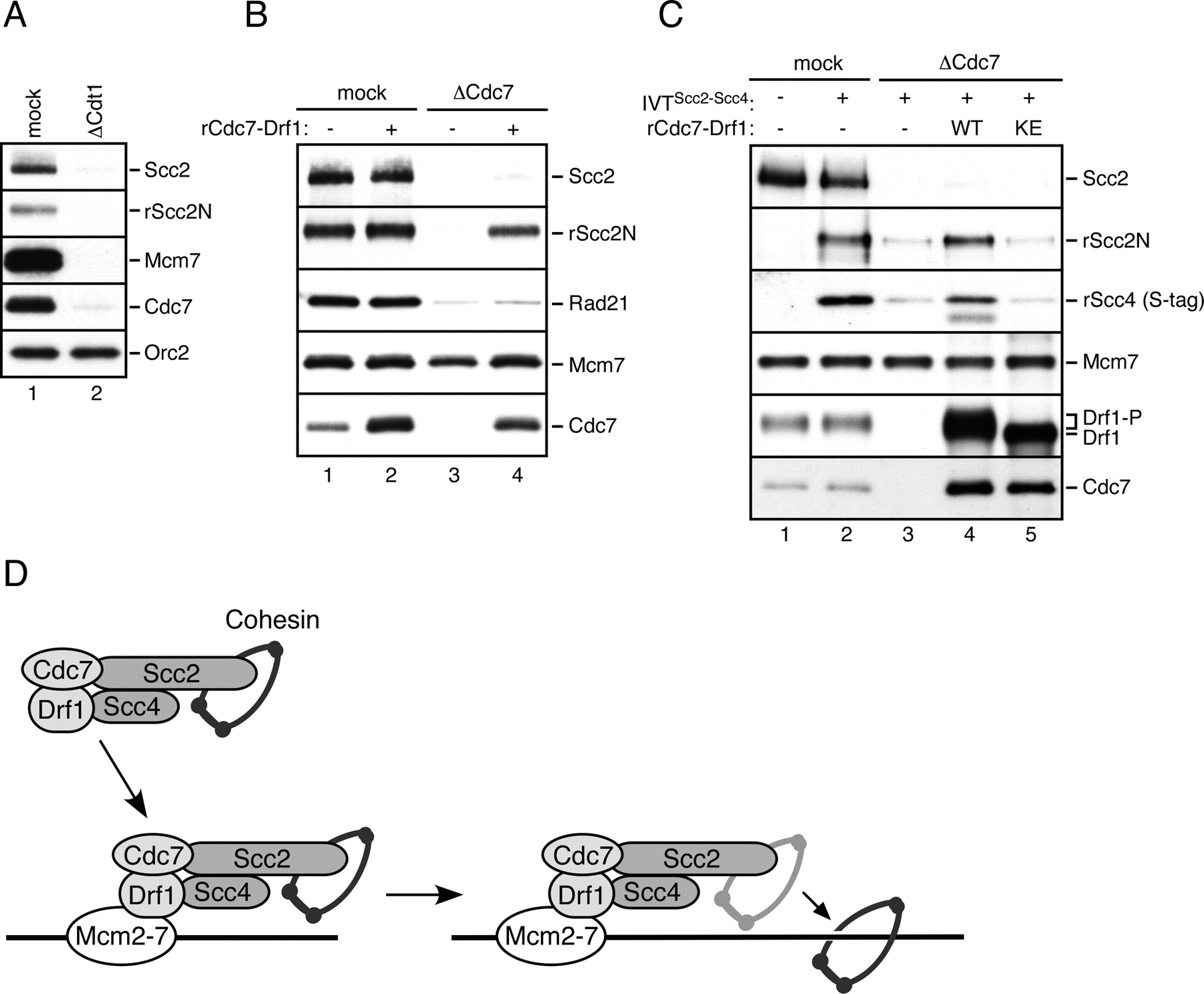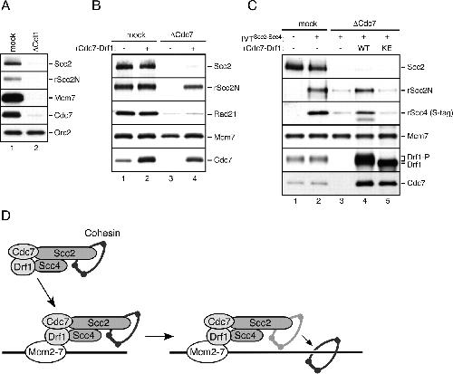 Figure 6. Binding of Scc2NâScc4 complex to chromatin requires the pre-RC and DDK. (A) HSS was depleted with control antibody (lane 1) or Cdt1 antibody (lane 2), and then supplemented with Scc2N and Scc4 expressed in IVT lysates. Sperm chromatin was incubated in the HSS, and after 30 min chromatin-bound proteins were isolated and probed with the indicated antibodies. (B) HSS was depleted with control antibody (lanes 1,2) or Cdc7 antibody (lanes 3,4), and then supplemented with Scc2 and Scc4-expressed IVT lysates (lanes 1â4), buffer (lanes 1,3), or 50 nM of rCdc7âDrf1 (His-Strep purified, lanes 2,4). Sperm chromatin was incubated in the HSS and isolated at 30 min. Chromatin-bound proteins were probed with the indicated antibodies. (C) HSS was depleted with control antibody (lanes 1,2) or Cdc7 antibody (lanes 3â5), and then supplemented with unprogrammed IVT lysate (lane 1), or Scc2 and Scc4-expressed IVT lysates (lanes 2â5), buffer (lanes 1â3), 180 nM of wild-type rCdc7âDrf1 (WT; His-Flag-purified, lane 4), or 180 nM of catalytically inactive rCdc7K59EâDrf1 (KE; His-Flag-purified, lane 5). Sperm chromatin was incubated in the HSS and isolated at 30 min. Chromatinbound proteins were probed with the indicated antibodies. (D) A model for the chromatin loading mechanism of Scc2âScc4 and cohesin. DDK physically associates with Scc2âScc4, which in turn binds cohesin. The DDK component of this ternary complex docks onto Mcm2-7 and brings Scc2âScc4 and cohesin close to the chromatin, thereby allowing cohesin deposition on DNA. |