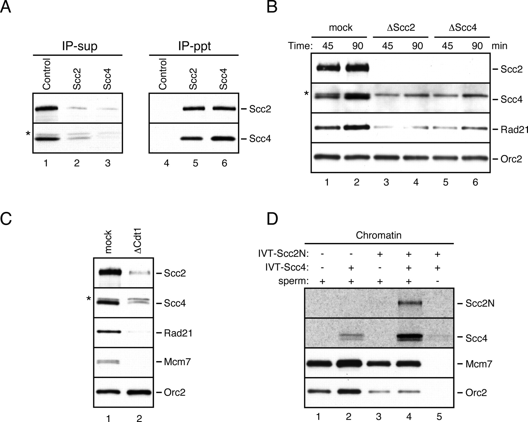 Figure 1. Xenopus Scc2âScc4 is required for pre-RC-dependent cohesin recruitment to chromatin. (A) IP was performed with control (lanes 1,4), anti-Scc2 (lanes 2,5), or anti-Scc4 antibody (lanes 3,6) from LSS. Supernatants (IP-sup; lanes 1â3) or immunoprecipitates (IP-ppt; lanes 4â6) were probed with Scc2 (top panel) or Scc4 (bottom panel) antibody. (*) Cross-reacting band. (B) Sperm chromatin was incubated in mock-depleted (lanes 1,2), Scc2-depleted (lanes 3,4), or Scc4-depleted LSS (lanes 5,6), and isolated at the indicated times. Chromatin-bound proteins were probed with the indicated antibodies. (*) Cross-reacting band. (C) Sperm chromatin was incubated in either mock-depleted (lane 1) or Cdt1-depleted LSS (lane 2) and isolated after 90 min. Chromatin-bound proteins were probed with the indicated antibodies. (*) Cross-reacting band. (D) IVT-expressed Xenopus Scc2(1â1024) (lanes 3â5), IVT-expressed Scc4 (lanes 2,4,5), or unprogrammed IVT lysate (2.5 μL of each) was added to 10 μL of HSS. Sperm chromatin was added to the HSS-IVT mixture at 10,000/μL concentration relative to HSS (lanes 1â4) and isolated after 30 min. Chromatin-bound proteins were probed with the indicated antibodies. |