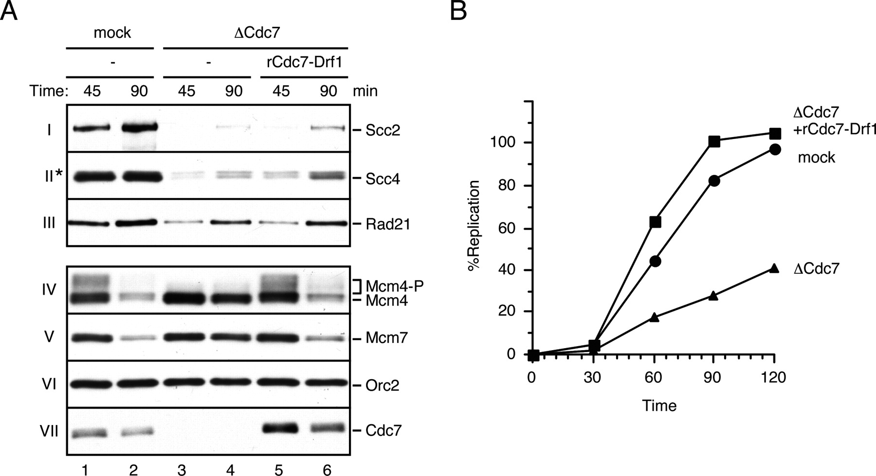 Figure 2. Cdc7-depletion impairs chromatin association of the Scc2âScc4 complex. (A) Sperm chromatin was incubated with mock-depleted (lanes 1,2) or Cdc7-depleted LSS (lanes 3â6) supplemented with buffer (lanes 1â4) or 40 nM rCdc7âDrf1 (lanes 5,6) and isolated at the indicated time points. Chromatin-bound proteins were probed with the indicated antibodies. (*) Cross-reacting band. (B) The reactions described in A were separately incubated with [α-32P]dATP. The replication efficiency was calculated based on incorporation of 32P-α-dATP (see the Materials and Merthods) and the results were graphed. |