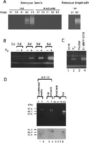 Fig. 5. Detection and identification of gelatinolytic enzymes by zymographic and immunoblotting analyses. (A) Gelatin zymographic analysis of Xenopus laevis tail and hindlimb and Xenopus tropicalis tail. Each lane contains 1 µg total protein at the indicated stage. (B) Gelatin zymographic analysis of conditioned media from TH-treated XLT-15 cultured cells. Each lane contains 10 µL of conditioned medium from the cultured cells treated with or without 10 nm T3. The numbers above the lanes refer to days of T3-treatment. (C) Gelatin zymographic analysis of conditioned media from the cultured cells transfected with Xl MMP-9TH expression construct. Each lane contains 10 µL of conditioned medium. XLT-15â11 cultured cells (Nakajima et al. 2000) were treated without (lane 1) or with 10 nm T3 (lane 2) for 3 days. Alternatively, XLT-15â11 cultured cells were transfected with a vector (lane 3) or Xl MMP-9TH expression construct (lane 4) and incubated for 3 days. (D) Comparison of zymogram and immunoblot reacted with anti-Xl MMP-9TH serum. The upper and lower panels are gelatin zymogram and immunoblot using rabbit anti-Xl MMP-9TH serum, respectively. In the gels for zymographic and immunoblot analyses, 2 and 12 µL of conditioned medium of XLT-15 cells cultured for 5 days without or with 10 nm T3 (lanes 1 and 2), 11 and 66 µg of total cellular protein from XLT-15 cells treated for 3 days in the absence or presence of T3 (lanes 3 and 4), and 3 and 20 µg of protein from hindlimb (lanes 5 and 6) or tail (lanes 7 and 8) of stage 56 and 63 tadpoles were loaded, respectively.