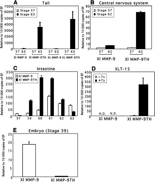 Fig. 4. Quantitative real-time reverse transcriptionâpolymerase chain reaction (RTâPCR) analysis of MMP-9 and MMP-9TH mRNA expression. Total RNA was extracted and subjected to quantitative real-time RTâPCR to determine MMP-9 and MMP-9TH mRNA levels normalized to elongation factor-1α (EF) expression. Real-time RTâPCR was performed using total RNA isolated from tails of stage 57 and 63 tadpoles of Xenopus laevis and Xenopus tropicalis (A), central nervous system of stage 57 and 62 tadpoles (B), intestine of stage 57â63 tadpoles (C), XLT-15 cells cultured in the absence (control) or presence of 10 nm T3 for 20 h (D), and whole embryo of stage 39 (E). Results are the means ± SE of three independent experiments. The levels of MMP-9 and MMP-9TH mRNA are shown as copy numbers relative to 10 000 copies of EF mRNA.