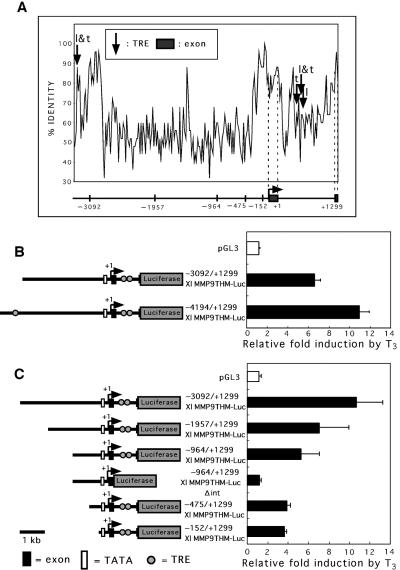 Fig. 6. Transient transfection assays of luciferase expression driven by the Xl MMP-9TH promoter. (A) Sequence comparison of genomic DNA surrounding the promoter in Xl and Xt MMP-9TH genes. The percentage nucleotide sequence identity in every 25 bp is indicated on the diagram. The MMP-9TH gene structure is represented below. The exons are indicated by dark boxes. The numbers show distance from the transcription initiation site (+1). The locations of putative TRE in the promoters of Xenopus laevis and Xenopus tropicalis are indicated with arrows labeled by l and t, respectively. (B,C) XLT-15 cells were transiently co-transfected with 25 ng of the indicated constructs, 12.5 ng of xTRα expression vector, 12.5 ng xRXRα expression vector and 5 ng of pRL-CMV. Two days after transfection, cells were incubated for 24 h in the presence or absence of 10 nm T3. Cells were lyzed, and luciferase assays were conducted. When xTRα and xRXRα expression vectors were removed in transient transfection assays, the induction by T3 decreased to 1.1-fold and 1.2-fold, respectively. Each point was performed in triplicate and repeated at least three times. The data are presented as fold induction by T3. The error bars represent the SE.