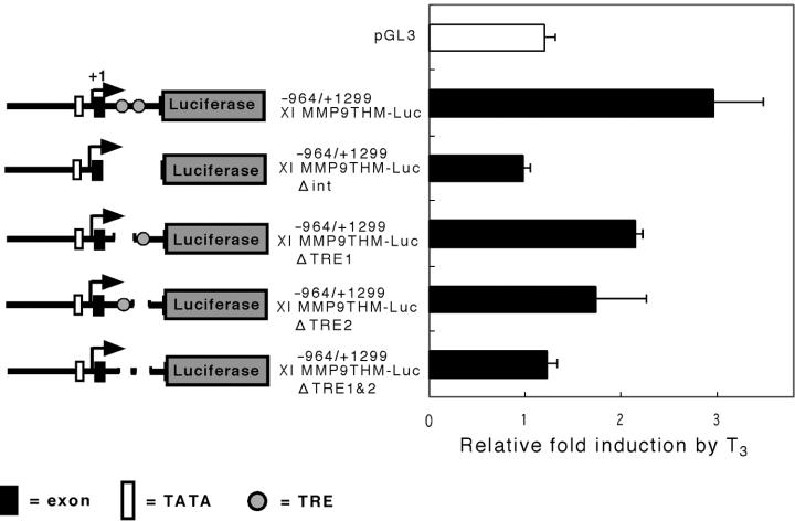 Fig. 7. Identification of functional T3 responsive elements in the first intron of the Xl MMP-9TH gene. The regions of nucleotides +204 to +1258 (a portion of the first exon and almost all the first intron), nucleotides +745 to +760, nucleotides +771 to +786, and nucleotides +745 to +760 and nucleotides +771 to +786 were deleted to generate the −964/+1299 Xl MMP-9THM-Lucδint,δTRE1,δTRE2, and δTRE1&2, respectively. These vectors were transfected as described in the legend to Figure 6. Each point was conducted in triplicate and repeated three times. Results are expressed as fold induction by T3. The error bars represent the SE.