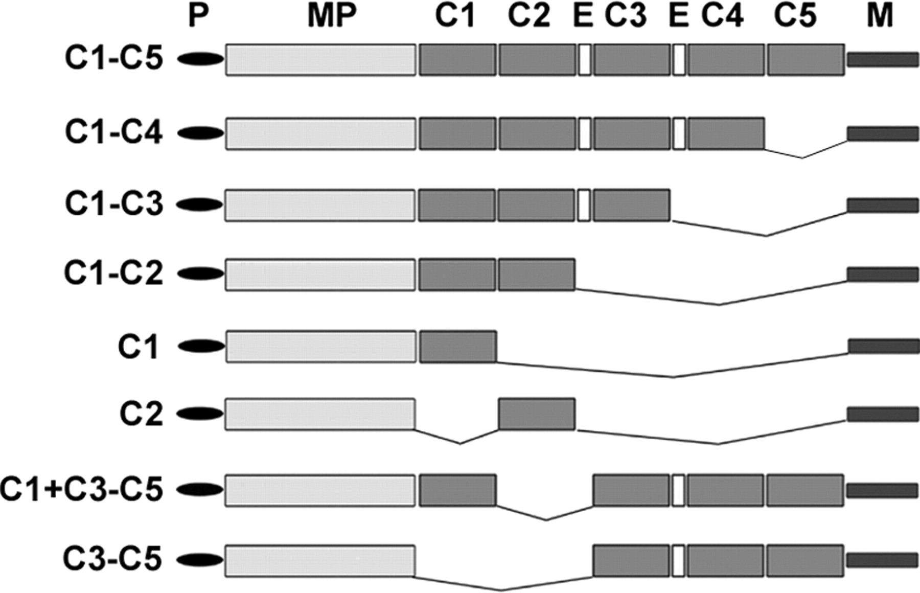 used in this study. P, proregion; MP, metalloprotease domain, C1–5, CUB