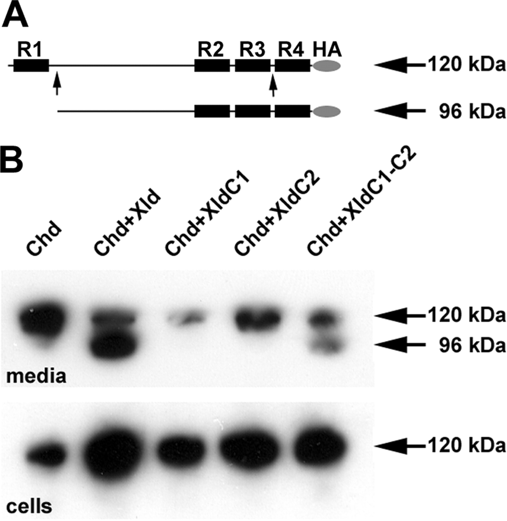 repeats (R1–R4) and Xld cleavage sites (arrows). The 120-kDa full-length protein