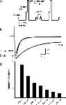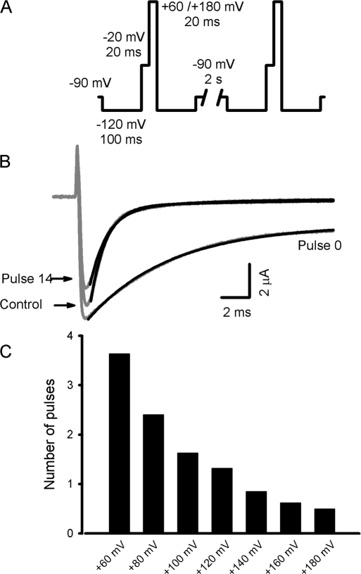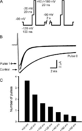 Figure 2. Ts3 voltage-dependent displacement. (A) Pulse protocol used to remove the bound Ts3. A strong depolarizing pulse, varying from +60 to +180 mV during 20 ms, was applied just after a −20 mV test pulse. Between pulses the oocytes were held at −90 mV, and the protocol was repeated at least 15 times. (B) Traces (gray lines) obtained in control conditions, in the presence of Ts3 (Pulse #0) and after 14 successive depolarization to +120 mV, by applying the protocol described above (Pulse #14) in the absence of Ts3. Black lines shows the curves obtained by fitting the data with function 1 (see Materials and methods). (C) Voltage dependence of toxin removal, obtained by applying the pulse protocol described in A. The graph shows the data obtained from a representative experiment. The number of pulses needed to an e-fold displacement was calculated by fitting the slow component contribution decay with a single exponential function. |