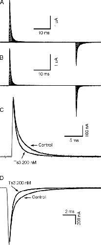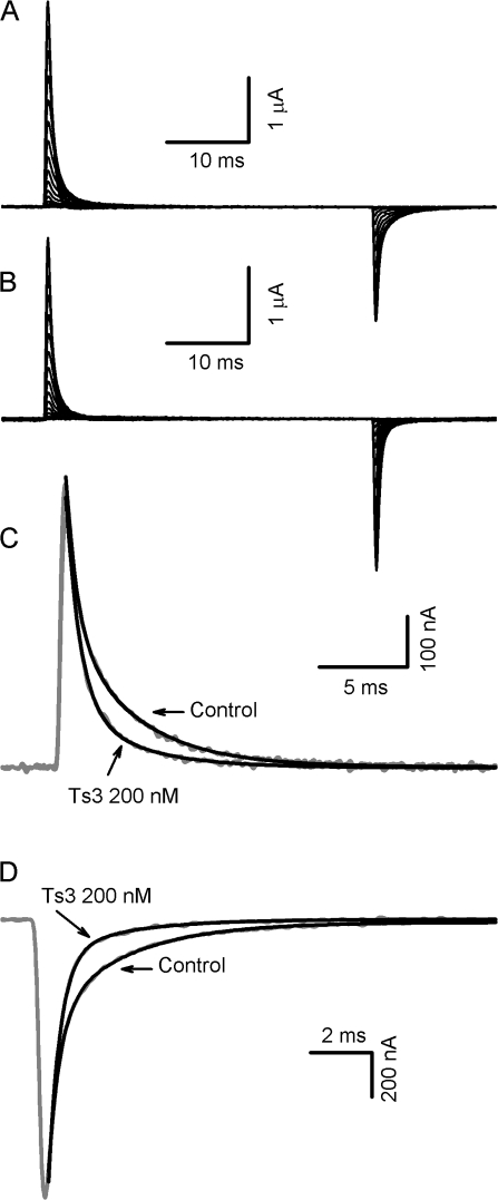 Figure 3. Effects of Ts3 on Nav 1.4 sodium channel gating currents. (A) Superimposed representative gating currents obtained in control conditions. Holding potential was −80 mV. ON gating currents were recorded with 40-ms pulses varying from −150 to +40 mV following a 100-ms prepulse to −120 mV. OFF gating currents were recorded with 40-ms pulses to −120 mV, preceded by pulses varying from −150 to +40 mV. (B) Superimposed representative gating currents obtained after the treatment with 200 nM of Ts3, by applying the protocol described in A. Experiments were performed at 14°C. (C) Comparison of traces of the ON gating currents obtained at −40 mV (gray lines) before and after the treatment with Ts3. Solid lines show the best fits obtained with function 1. (D) Comparison of traces of the OFF gating currents obtained at −120 mV after a pulse to −40 mV (gray lines) before and after the treatment with Ts3. Solid lines show the best fits obtained with function 1. |