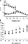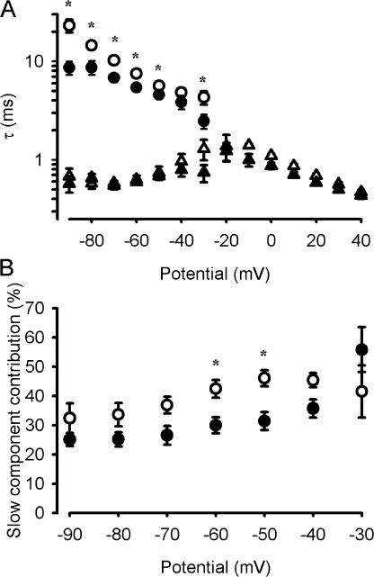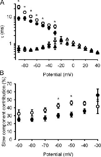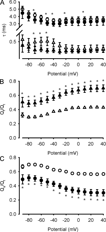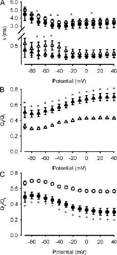 Figure 5. Effects of Ts3 on the kinetic parameters of the OFF gating currents. The parameters were obtained by fitting the OFF gating current decay with function 1. Gating currents were recorded as described in Fig. 3 A. (A) Fast and slow time constants of the gating current decay. (B) Fraction of charge carried by the fast component of the OFF gating current decay. (C) Fraction of charge carried by the slow component of the decay. White triangles show the fast component in control conditions, black triangles show the fast component in the presence of Ts3, white circles show the slow component in control conditions, and the black circles show the slow component in the presence of Ts3. Note that for some of the potentials, the error bars are smaller than the symbols. Data shown as mean ± SEM, n = 4. *, existence of statistical difference (P < 0.05) between compared groups. |