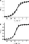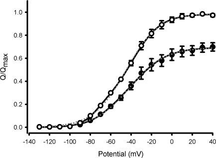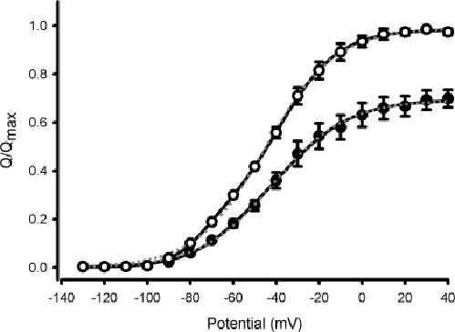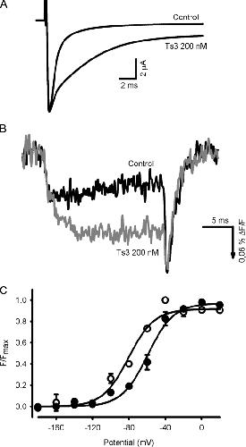 Figure 6. Effects of Ts3 in the charge–voltage relationship. White symbols represent the Q-V curve obtained in control conditions (mean ± SEM, n = 3), and black symbols the curve obtained after the treatment with 200 nM of Ts3 (mean ± SEM, n = 3). The amount of charge recorded in each potential was normalized to the maximum charge recorded before the treatment with Ts3. Solid black lines are the curves obtained by fitting the data with a double Boltzmann function (function 2). Dotted gray lines are the curves obtained by fitting the data with a single Boltzmann function. Experiments were performed at 14°C. |