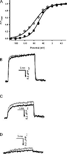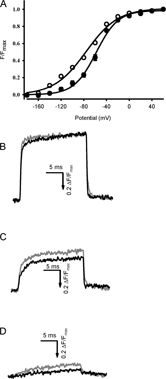 Figure 9. Effects of Ts3 in the fluorescence changes that track the movement of the S4 segment of domain I of mutant channel S216C stained with TMRM. Traces were recorded as described in Fig. 7. (A) F-V curves obtained before (white symbols) and after (black symbols) the treatment with 200 nM Ts3 (mean ± SEM, n = 3). The fluorescence recorded at each potential was normalized to the maximal fluorescence. Solid lines are the curves obtained by fitting the data with function 3. (B–D) Superimposed representative traces obtained at +60 (B), −60 (C), and −120 (D) before (gray traces) and after (black traces) the treatment with 200 nM of Ts3. The signals are shown as ΔF/F (%), where F is the fluorescence background. The arrow indicates the direction in which fluorescence increases. These experiments were performed at room temperature. |