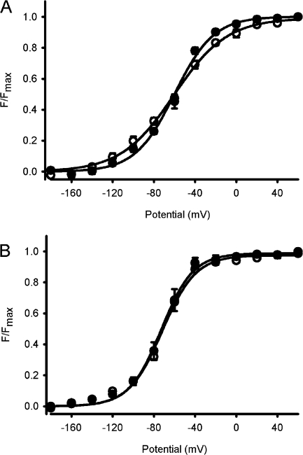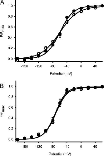 Figure 10. Effects of Ts3 in the fluorescence changes that track the movement of the S4 segment of domains II and III, using the mutant channel S660C and L1115C stained with TMRM. Traces were obtained as described in Fig. 7. (A) F-V curves obtained from S660C channels before (white symbols) and after (black symbols) the treatment with 200 nM Ts3 (mean ± SEM, n = 3). The fluorescence recorded at each potential was normalized to the maximal fluorescence. Solid lines are the curves obtained by fitting the data with the function 3. (B) F-V curves obtained from L1115C channels before (white symbols) and after (black symbols) the treatment with 200 nM Ts3 (mean ± SEM, n = 3). The fluorescence recorded at each potential was normalized to the maximal fluorescence. Solid lines are the curves obtained by fitting the data with function 3.These experiments were performed at room temperature. |