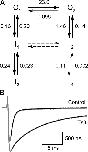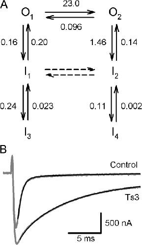 Figure 11. Kinetic model of inactivation. (A) Kinetic diagram showing the open (O) and inactivated (I) states of the channel. Closed states are not shown and are assumed not to participate on the decay phase of the current at 0 mV (see Discussion). O1 is invariably the first activated state. The numbers indicate the rate constants (in ms−1) obtained by fitting the decay of the sodium current in the presence and absence of Ts3. In the presence of Ts3 the transitions between O1 and O2, and between I1 and I2, are blocked. (B) Experimental records in the presence and absence of Ts3 are superimposed with the theoretical curve calculated using the model and its rate constants. |