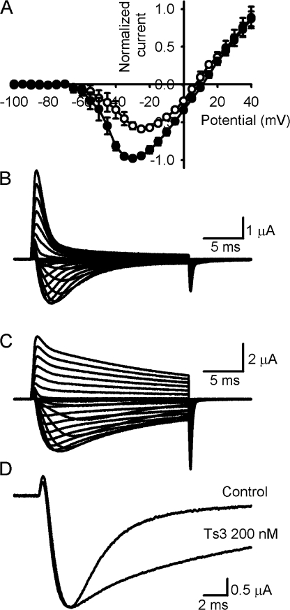 Figure 1. Effect of Ts3 on sodium currents from Xenopus oocytes expressing Nav1.4. (A) I-V curves obtained before (white circles) and after (black circles) the treatment with 200 nM of Ts3. Both curves were normalized by the maximal current obtained in the presence of toxin. Data shown as mean ± SEM (n = 4). Sodium currents were recorded with 20-ms pulses varying from −100 to +40 mV, which were followed and preceded by a 100-ms pulse to −100 mV. The holding potential was −90 mV. (B) Representative traces obtained in control conditions. (C) Representative traces obtained after the treatment with 200 nM of Ts3. (D) Superimposed recordings obtained at −20 mV before and after the treatment with Ts3. The traces were normalized by the peak value. Experiments were performed at 14°C. |