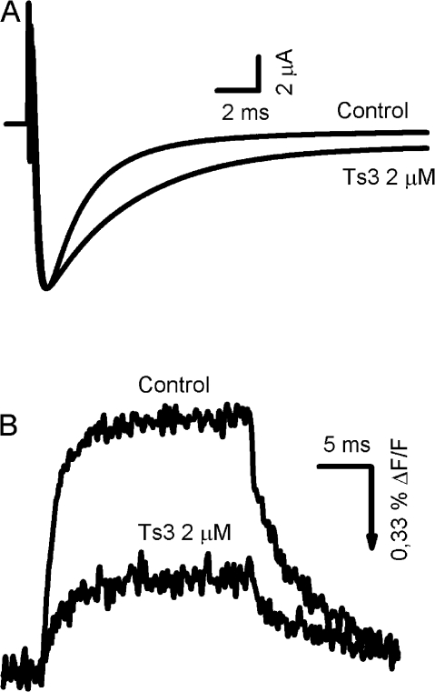 Figure 7. Effects of Ts3 in the fluorescence changes that track the movement of the S4 segment of domain IV of mutant channels S1436C stained with TMRM. Holding potential was −80 mV and the test pulse was preceded by a 200-ms pulse to −90 mV. (A) Representative sodium currents recorded at −20 mV before and after the treatment with 2 μM Ts3. (B) Representative fluorescence signals obtained at −20 mV before and after the treatment with 2 μM of Ts3. The signals are shown as ΔF/F (%), where F is the fluorescence background. The arrow indicates the direction in which fluorescence increases. These experiments were performed at room temperature. |