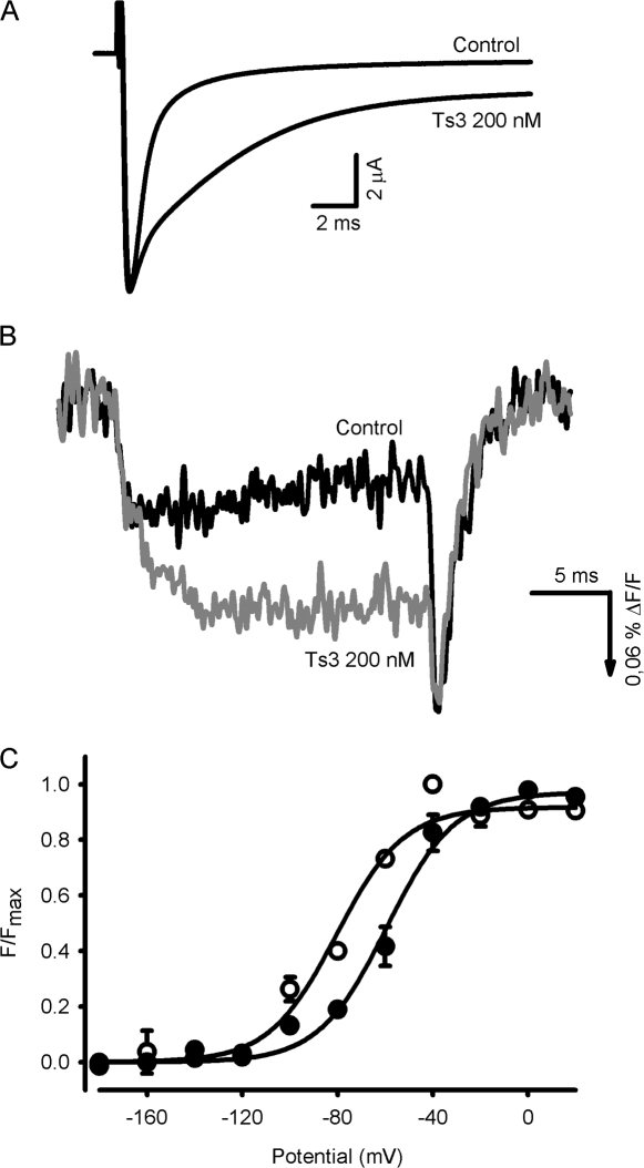 Figure 8. Effects of Ts3 on the fluorescence changes that track the movement of the S4 segment of domain IV of mutant channels L1439C stained with TMRM. Traces were recorded as described in Fig. 6. (A) Sodium currents recorded at −20 mV before and after the treatment with 200 nM Ts3. (B) Fluorescence signals obtained at −20 mV before (black trace) and after (gray trace) the treatment with 200 nM of Ts3. The signals are shown as ΔF/F (%), where F is the fluorescence background. The arrow indicates the direction in which fluorescence increases. These experiments were performed at room temperature. (C) F-V curves obtained before (white symbols) and after (black symbols) the treatment with 200 nM of Ts3 (mean ± SEM, n = 3; paired experiments). Solid lines are the curves obtained by fitting the data with the function 3. |
