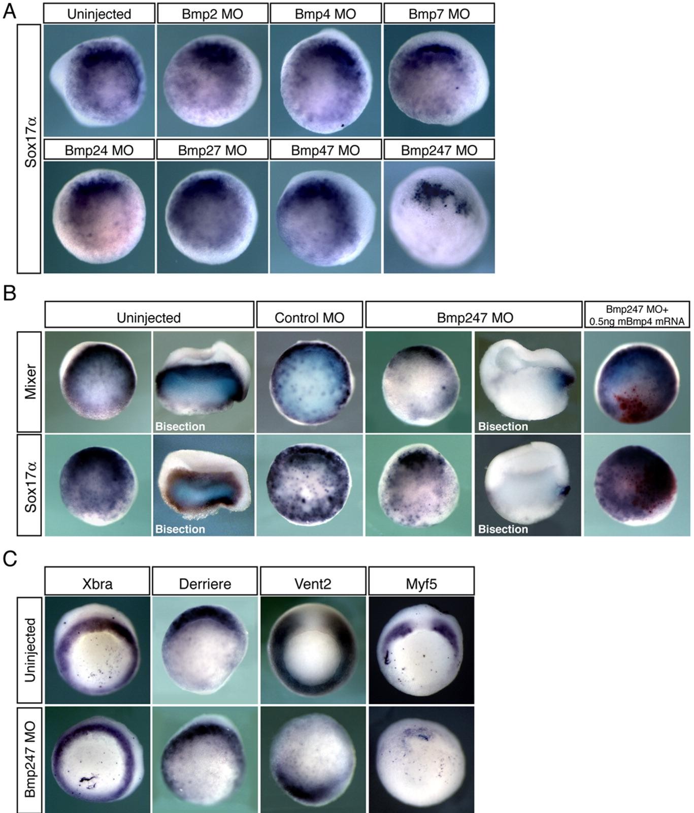 Figure 4. Bmp signaling is essential for endoderm formation in Xenopus. X. tropicalis embryos were injected at the two-cell stage with 10 ng per blastomere of each MO indicated, then analyzed for expression of Sox17 alpha (A, B) or Mixer (B) at stage 10.5. Miniruby fluorescent dextran was used as a tracer for MO injection. In B, a subset of MO-injected embryos were re-injected in one ventralblastomere at the 4-cell stage with 0.5 ng of mouse Bmp4. Nuclear beta -galactosidase (red) was used as a tracer. C: Triple Bmp morphant embryos were also analyzed for expression of Xbra, Derriere, Myf5, and Vent2.