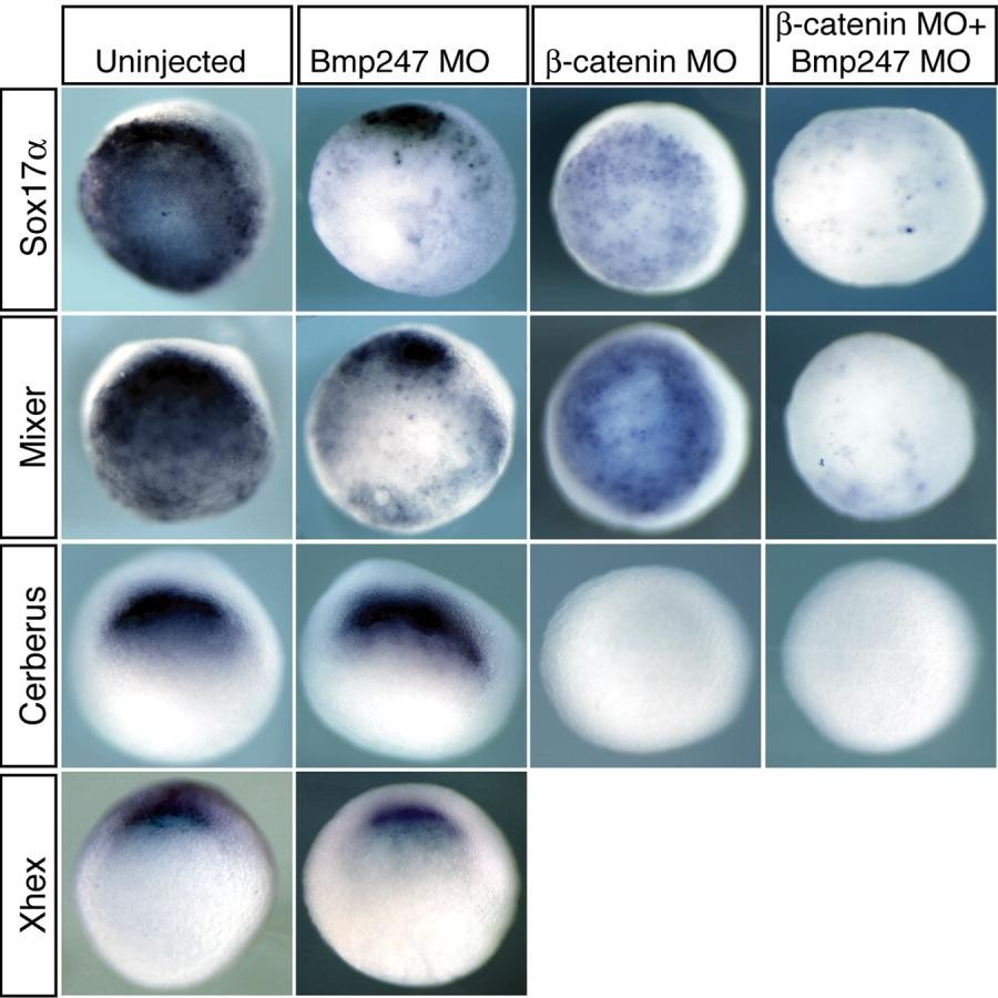 Figure 5. Combination of Wnt and Bmp signaling is required for endoderm formation. X. tropicalis embryos were injected with 10 ng per blastomere of each MO indicated at the 2-cell stage, then analyzed at stage 10.5 for expression of the general endoderm markers Sox17 alpha and Mixer, or the dorsoanterior endoderm markers Cerberus and Xhex.