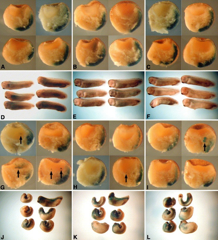 Fig. 4. Inhibition of caspases rescues cell death but not gastrulation movements in PDGFR-37-injected embryos. Embryos were co-injected dorsoanteriorly with mRNAs encoding β-gal NLS and (AâF) PDGFR-FS or (GâL) PDGFR-37 at the 2- to 4-cell stage. At the blastula stage (stages 8â9), the blastocoel cavity was injected with 400 uM of (B, E, H, K) a general caspase inhibitor (z-VAD-fmk) or (C, F, I, L) a caspase 3 inhibitor (z-DEVD-fmk). The embryos were cultured until stage 11.5 or 28 before being fixed and stained for β-gal. Note, no β-gal-positive cells in the blastocoel of PDGFR-FS-injected embryos (AâC) and in the PDGFR-37-injected embryos, the rescue of cells with diffuse β-gal staining by caspase inhibitors (compare G with H, I). Caspase inhibitor-injected embryos, however, still exhibit gastrulation defects at stage 28 (compare J with K, L). Cells with diffuse β-gal staining are indicated (arrows).