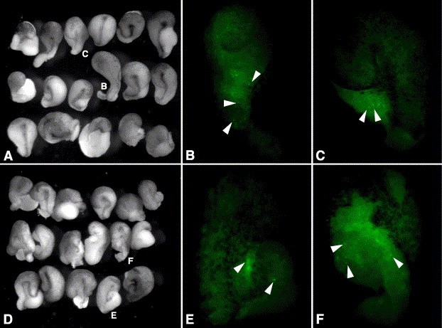 Fig. 5. PDGFR signaling is not required for convergent extension of open-faced Keller explants. Keller explants were dissected at stage 10.25 from embryos co-injected with Gap43-GFP and either PDGFR-FS or PDGFR-37 mRNAs (see Material and methods). The explants were cultured until stage 20. GFP-positive explants were fixed in MEMFA to quench the GFP fluorescence, and subjected to TUNEL staining using dUTP conjugated to fluorescein. (A) PDGFR-FS-injected explants elongate to a similar extent as (D) PDGFR-37-injected explants. (B, C) PDGFR-FS-injected explants contain a similar number of TUNEL-positive, fluorescein-labeled, cells as (E, F) PDGFR-37-injected explants. Examples of TUNEL-positive cells are indicated (arrowheads). The explants from three independent experiments are shown in A and D.
