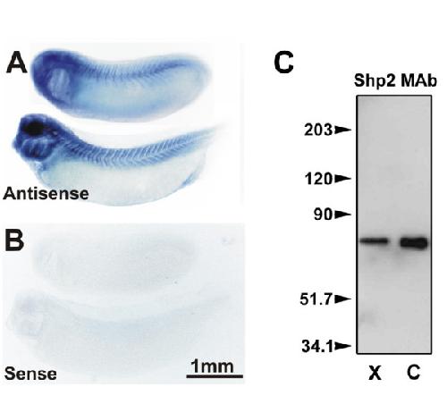 Figure 1. Shp2 expression in embryonic Xenopus muscle. In situ hybridization assays for Shp2 mRNA were carried out with anti-sense (A) and control sense (B) probes using stage 22 (A and B, upper) and 28 (lower) Xenopus embryos. Specific labeling was observed with Shp2 mRNA anti-sense probe in myotomal muscle and brain. C. TX-100 total protein extracts of Xenopus tadpoletailmuscle ("X") and cultured C2 myotubes ("C") were immunoblotted with an anti-Shp2 monoclonal antibody. A band of about 70 kD was observed in both samples. Positions of molecular weight markers are indicated on the left.