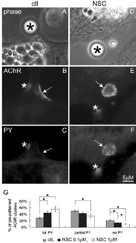 Figure 5. Blockage of tyrosine dephosphorylation of pre-patterned AChR clusters by NSC-treatment. R-BTX-labeled muscle cells were exposed to HB-GAM beads for 4 h in the absence (A-C) or presence of 1 μM NSC-87877 (D-F), fixed and then stained with anti-phosphotyrosine (mAb4G10) and FITC-conjugated secondary antibodies. In the example of the control muscle cell shown here, phosphotyrosine is detected at the bead-induced cluster (B, C; asterisks) but not at the pre-patterned cluster (B, C; arrow), but in the NSC-treated muscle cell, both the bead-induced cluster (E, F: asterisks) and the pre-patterned cluster (E, F: arrows) contain phosphotyrosine. G. Pooled data from multiple experiments were quantified after sorting the pre-patterned AChR clusters present on bead-stimulated cells as being fully tyrosine phosphorylated or partially or fully dephosphorylated. Control, n = 127; 0.1 μM NSC, n = 129; 1 μM NSC, n = 94; *p < 0.05 NSC relative to control.