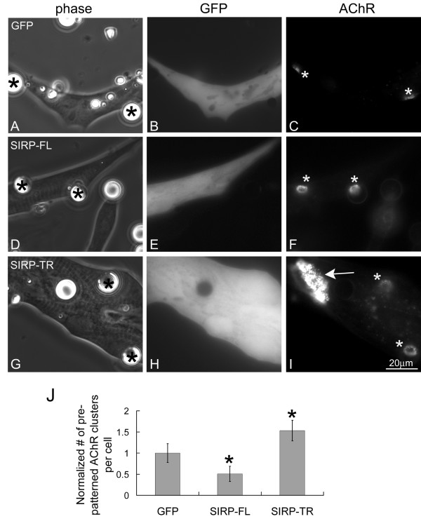 Figure 8. SIRPα1's regulation of pre-patterned AChR cluster dispersal. R-BTX labeled muscle cells expressing GFP alone (A-C) or GFP and wild-type SIRPα1 (SIRP-FL; D-F) or dominant-negative SIRPα1 (SIRP-TR, G-I) were exposed to HB-GAM beads overnight. In the muscle cell expressing dominant-negative SIRPα1, a large pre-patterned AChR cluster was detected (I; arrow) in addition to the bead-induced clusters, which were present in control and Shp2-expressing cells (C, F, I; asterisks). Results, quantified as described in Fig. 7, revealed that the expression of wild-type SIRPα1 promoted the dispersal of pre-patterned AChR clusters whereas expression of dominant-negative SIRPα1 inhibited dispersal (panel J). GFP-cells, n = 198; SIRP-FL, n = 156; SIRP-TR, n = 169; *p < 0.05 relative to GFP-cells.