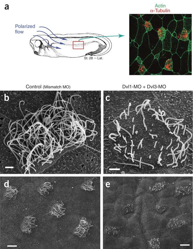 Figure 1. Dvl is essential for ciliogenesis in multi-ciliated cells. (a) The epidermis of the Xenopus embryo is composed of multi-ciliated cells and mucus-secreting cells. Ciliated cells, labeled by alpha-tubulin immunostaining (red), are evenly spaced between mucus-secreting cells. Polarized beating of cilia generates directional flow across the epithelium16, 26. (b) Normal ciliated cell from a control-injected embryo (injected with a mismatched morpholino). (c) Defective cilia outgrowth in Dvl1âDvl3 double morphants. (d) Wider field view of control (mismatch morpholinoâinjected) embryo. (e) Wider field view of Dvl1âDvl3 double morphant embryo showing many affected cells.