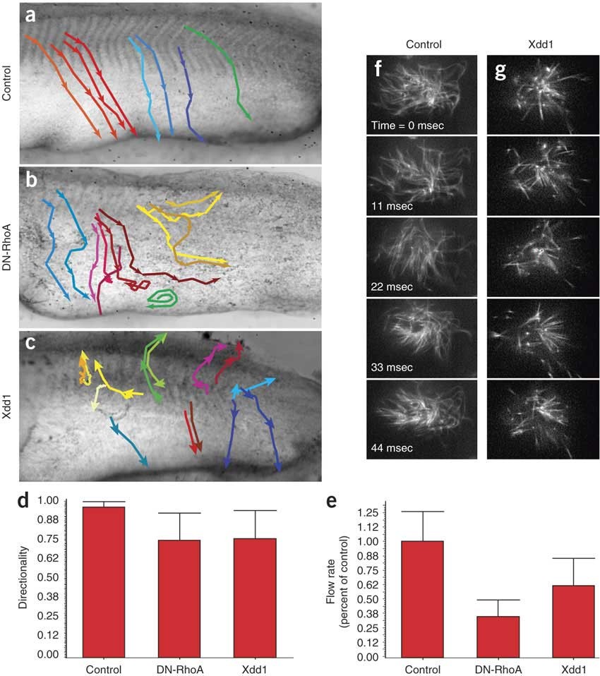 Figure 8 - Dvl and Rho govern directional fluid flow across the ciliated epidermis. (a) Control embryos were grown until stage 26, and latex beads were added to the media to visualize fluid flow over the epidermis. The movement of beads was recorded and representative beads were tracked. Representative bead movements were tracked from the horizontal myoseptum, as indicated by the colored lines. Beads move from dorso-anterior to ventral-posterior uniformly in control embryos. (b) DN-RhoA expression severely disrupts directional flow; beads were turning and swirling frequently. (c) Xdd1 expression severely disrupts directional flow; beads were turning and swirling frequently. (d) The directionality of beads was quantified as the ratio of the linear distance between the first and last point of a track and the total distance along the track. A straight line would be a value of 1.00. Error bars, s.d. (e) DN-RhoA or Xdd1 reduces the rate of bead movement across the epidermis. Defects in polarized flow were evident in that even beads moving in comparatively straight paths moved at a greatly reduced rate across experimental embryos. Error bars, s.d. (f) Still images from a high-speed time-lapse movie of beating cilia labeled with tau-GFP. (g) Still images from a high-speed time-lapse movie of beating cilia expressing Xdd1; frequency is comparable to controls.