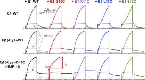 Figure 3. Q1 and E1 mutations investigated in this study preserve Q1 channel function and Q1/E1 interactions. Current traces are recorded from three batches of oocytes, expressing Q1-WT (top), Q1(-Cys)-WT (middle), or Q1(-Cys)-I145C (bottom), alone or with E1 WT or mutants at 1:1 cRNA molar ratio. The type of Q1 variant is marked on the left of each row, while the type of E1 variant is marked on the top of each column. In the case of Q1(-Cys)-I145C coexpressed with Cys-substituted E1 mutants, oocytes are treated with DTT (10 mM for 10 min, or 25 mM for 5 min) and thoroughly rinsed before current recording. The voltage clamp protocol is diagrammed in the inset of top row. To illustrate the effects of E1 variants on the channel function of each of the Q1 variants, in each row the same representative current trace recorded from an oocyte expressing respective Q1 variant alone is shown as a gray trace, superimposed with current traces from oocytes coexpressing E1 variants. To illustrate the current enhancing effects of E1 variants on the Q1 channels, the current traces are scaled to reflect the average ratio of current amplitudes of Q1+E1 vs. Q1 alone in the same batch of oocytes (the exact numbers of fold-increase in current amplitudes are listed in Table II). Q1(-Cys)-I145C coexpressed with E1-G40C manifests a unique time-independent component (Istep) and a time-dependent component (It-d). To ascertain that this is not due to interference from oocyte leak conductance, current traces in the third row are HMR-sensitive current (HMR ΔI = control current – current recorded in the presence of 10 uM HMR; Wu et al., 2006a). Dotted lines denote the zero current level. |