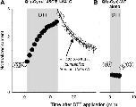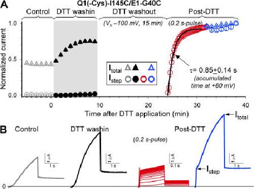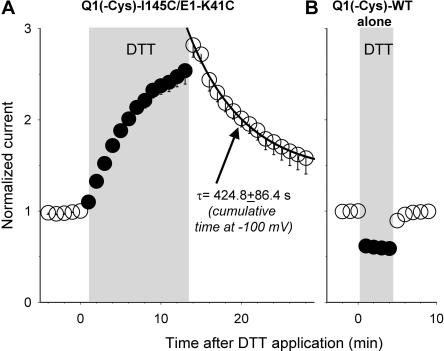 Figure 9. (A) Time course of changes in current amplitudes of Q1(-Cys)-I145C/E1-K41C before, during, and after DTT (10 mM) exposure. Data are averaged from six experiments. Oocyte membrane is pulsed from Vh −100 mV to +60 mV for 2 s, followed by repolarization to −60 mV for 2 s, once every 60 s. Current amplitudes at the end of the +60-mV step is measured and normalized by the control current before DTT exposure. The duration of DTT exposure is denoted by gray shade. The time course of current reduction after DTT washout is fit with a single exponential function (smooth curve superimposed on data points after DTT). The time constant (τ) is converted to cumulative time at Vh −100 mV (when channels are in the resting state). Mean and SEM values of τ are listed in inset. (B) Time course of changes in current amplitude of Q1(-Cys)-WT expressed alone before, during (gray shade), and after exposure to 10 mM DTT. Since there is no Cys in the Q1 channel, this experiment reveals a direct current-suppressing effect of DTT on the Q1 channel. The rapid onset of DTT effect and rapid/complete reversal reflect the time course of DTT equilibration in the bath solution during wash-in and rate of DTT clearance during washout. |
