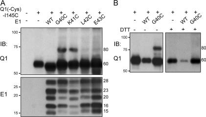 Figure 4. Testing disulfide bond formation between Q1 145C and Cys introduced into E1 positions 40–43. (A) COS-7 cells are transfected with cDNA(s) listed above (leftmost lane: no cDNA negative control). 48 h after transfection, cells are treated with NEM (to protect free thiol groups) followed by whole cell lysis and solubilization. Whole cell lysates are run on 7.5% and 14% nonreducing SDS gels. The former is probed for Q1 (with a V5 mAb targeting V5 epitope attached to the carboxyl end of Q1) and the latter is probed for E1 (with E1 pAb). Size marker positions are listed on the left, and sizes of Q1- or E1-specific bands are noted on the right (in kD). (B) Whole cell lysates prepared from COS-7 cells transfected with cDNA(s) listed above are each divided into two aliquots. One aliquot is treated with DTT (10 mM, room temperature, 10 min) while the other is incubated with buffer under the same conditions without DTT. All samples are run on a nonreducing SDS gel and probed for Q1 with V5 mAb. |