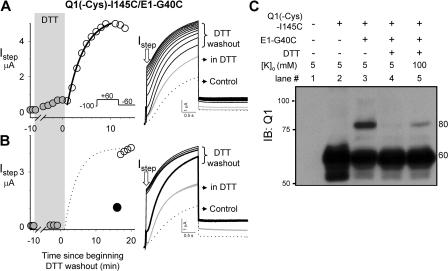 Figure 7. (A and B) Testing the state dependence of appearance of a constitutive component in oocytes expressing Q1(-Cys)-I145C/E1-G40C after DTT washout. Data from two experiments are shown, with time courses of appearance of the constitutive component (Istep) shown on the left, and superimposed current traces shown on the right. In both experiments, before DTT treatment, the oocytes manifest slowly activating currents without any constitutive component (dotted traces in right panels). The oocytes are exposed to DTT 10 mM for 10 min (gray shade, time axis breaks between start of DTT application and last few data points in DTT). In the presence of DTT, the current amplitudes increase but the currents remain slowly activating without a significant constitutive component (gray traces in the right panels). In A, during DTT washout the oocyte is repetitively pulsed from Vh −100 to +60 mV for 2 s, followed by a step to −60 mV for 2 s, once every minute (voltage clamp diagram in inset). The appearance of Istep follows a single exponential time course, with a time constant of 3.1 min (black thick curve superimposed on the open circle data points). In B, during DTT washout the oocyte is held at Vh −100 mV without pulsing for 15 min. The current induced by the first pulse after resuming pulsing is highlighted by the thick black current trace (right) and the small Istep component during the first pulse is highlighted by a solid black circle (left). The dotted curve is a scaled single exponential time course similar to that shown in Fig. 7 A. (C) Testing whether membrane depolarization by elevating [K]o facilitates disulfide bond formation between Q1 145C and E1 40C. COS-7 cells are transfected with cDNA(s) listed on the top two rows. Cells are incubated in medium containing 5 mM [K]o for 48 h. Cells in lanes 4 and 5 are treated with 10 mM DTT for 10 min to break disulfide bonds, followed by thorough rinsing to remove DTT. Cells in lane 4 are incubated in 5 mM [K]o medium, while cells in lane 5 are incubated in 100 mM [K]o medium for 10 min. All cell preparations are treated with NEM to protect free thiol groups, followed by whole cell lysis. Whole cell lysates are run on nonreducing SDS gel and probed for Q1 with V5 mAb. |