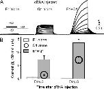 Figure 2. Validating the oocyte expression system for study of Q1/E1 interaction. Each oocyte is injected with cRNA for E1-WT alone (3 ng/oocyte, to monitor currents through oocyte endogenous xQ1 associated with E1-WT) (Sanguinetti et al., 1996), Q1-WT alone (10 ng/oocyte), or Q1-WT + E1-WT (10 and 3 ng per oocyte, respectively, cRNA molar ratio 1:1). Membrane currents are recorded on days 3 and 5 after cRNA injection. (A) Representative current traces elicited by the diagrammed protocol from oocytes injected with marked cRNA(s). (B) Mean current amplitudes at +60 mV from the three groups of oocytes. Note that the E1-alone currents are almost invisible at the same gain suitable for the other two groups, and the SE bar is buried in the line of the histogram bars. In all the experiments reported in this study, we inject the same amount of cRNA for Q1 and/or E1 variant per oocyte as listed above, including E1-WT alone, and currents are recorded on days 4â5 (unless otherwise noted). To quantify and compare current amplitudes in oocytes expressing Q1 plus E1 vs. Q1 alone, data from the former group are corrected for mean current amplitude of oocytes injected with E1-WT alone (representing contribution from oocyte xQ1/E1-WT in the same batch of oocytes). |