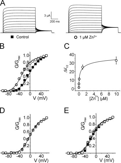 Figure 4. Metal ion binding to R294H-A351H stabilizes the activated state after neutralization of acidic residues D352 and E353. (A) Representative current traces from an oocyte expressing Kv1.2-R294H-A351H-D352G-E353S channels recorded in the absence (left) and presence (right) of 1 μM Zn2+, using the protocol outlined in the Materials and methods. (B) Normalized G-V relationships from oocytes expressing Kv1.2-R294H-A351H-D352G-E353S channels recorded in the absence (solid squares, n = 9) and presence (open circles, n = 9) of 1 μM Zn2+. (C) A plot of ΔV1/2 versus Zn2+ concentration in oocytes expressing Kv1.2-R294H-A351H-D352G-E353S channels, where ΔV1/2 is the difference between the fitted V1/2 values obtained in the absence and presence of varying concentrations of Zn2+. The data were fitted with a hyperbolic function (solid curve) with a half-maximal concentration of 0.36 ± 0.18 μM (n = 4–8). (D and E) Normalized G-V curves obtained in the absence (solid squares) and presence (open circles) of 1 μM Zn2+ for (D) Kv1.2-R294H-D352G-E353S (n = 7) and (E) Kv1.2-A351H-D352G-E353S (n = 7).