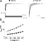 Figure 5. Metal bridge formation slows channel closure signifying stabilization of the open-activated channel conformation. (A) Representative current traces from an oocyte expressing Kv1.2-R294H-A351H-D352G-E353S channels recorded in the absence (left) and presence (right) of 1 μM Zn2+. Bath solution contained 50 mM K+ in order to visualize inward tail currents. (B) Plot of time constant for deactivation versus voltage for channels recorded in the absence (solid squares) or presence (open circles) of 1 μM Zn2+ (n = 7 each). Tail currents were fitted with a single exponential and the time constant of deactivation (τ, ms) plotted on a log scale against voltage.
