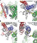 Figure 7. Comparison of the Kv1.2 crystal structure (Long et al., 2005) with instantaneous configurations taken from the MD simulations of the wild-type channel and mutant channels. (A) R294H-A351H-D352G-E353S (side and top view). (B) R294H-A351H (top view). (C) R294H-D352H (top view). Crystal structure is shown in gray. Mutant channel is represented as following: S1-cyan, S2-yellow, S3-red, S4-blue, pore-green, and Zn2+-violet. All the mutant structures were taken from the last snapshot of the MD trajectories. (See online supplemental material for the coordinates of the open activated Kv1.2 model obtained from R294H-A351H-D352G-E353S simulation in the presence of metal bridge).
