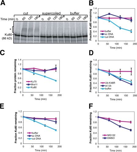 Figure 2. DSBs lead to the proteasomal degradation of Ku80. (A) Cut linear DNA, supercoiled circular DNA, or buffer was added to extract containing 35S-labeled Ku80. After incubation at 22°C for the indicated times, samples were taken. The asterisk indicates DSB-dependent modified Ku80. Radioactively labeled protein was visualized using a phosphorimager. (B) Quantification of the radioactivity of the entire lane in A using a phosphorimager (n = 4). (C) Degradation, quantified as in B, of Ku80, Ku70, and Mre11 in the presence of cut DNA (n = 3). (D) Degradation, quantified as in B, of Ku80 in the presence of cut DNA and buffer, 0.5 mg/ml wild-type ubiquitin, or 0.5 mg/ml ubiquitin-K48R (n = 3). (E) Degradation of Ku80 in the presence of buffer, supercoiled DNA, or cut DNA. At indicated time points extract samples were spotted onto glass microfiber filters and precipitated in 10% TCA, and radioactivity was quantified using a liquid scintillation counter (n = 4). (F) Degradation, quantified as in E, of Ku80 in the presence of either DMSO or 100 μM MG132 (n = 4). Error bars denote one standard error of the mean. |