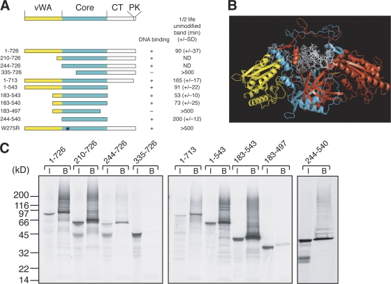 Figure 5. N- and C-terminal Ku80 truncations are ubiquitylated and degraded in response to binding to DSBs. (A) Domain organization of Ku80 is modified from a previous review (for review see Downs and Jackson, 2004). Ku80 domains include vWA, N-terminal von Willibrand A domain; Core, central core domain; CT, C-terminal region; PK, DNA-PKcsâinteracting peptide (Gell and Jackson, 1999). The core DNA-binding region is indicated in light blue, and the other regions of the protein included in the atomic structure are in yellow. Regions of the protein not included in the structure are white. Numbers to the left indicate amino acids included in the protein. An asterisk indicates the location of amino acid W275. Truncations were generated as indicated and labeled with 35S in rabbit reticulocyte lysate. Proteins were then mixed with egg extract, to which was added either SB-DNA beads to assess DNA binding or cut linear DNA to measure degradation. Half-lives of the unmodified bands after addition of cut DNA, quantified using a phosphorimager, are indicated. (B) The structure of the human Ku70/Ku80 heterodimer bound to DNA (Walker et al., 2001). Residues up to the equivalent of amino acid 543 of the X. laevis Ku80 are included in the structure. Red, Ku70; yellow, Ku80; white, DNA. The region of Ku80 required for DNA binding (X. laevis residues 244â540) is light blue. (C) Truncations were mixed with extract and incubated with SB-DNA beads for 45 min. Bound proteins were visualized by exposing to film. I, input; B, beads. |