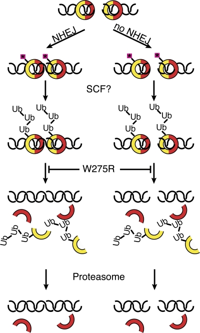 Figure 8. A model for Ku removal from DNA. Ku70 (red) and Ku80 (yellow) form a ring that encircles a DSB. The heterodimer either recruits other NHEJ proteins, repairing the break (left), or fails to do so (right). Binding to DNA causes Ku to become posttranslationally modified, possibly through phosphorylation (pink boxes). An E3 ubiquitin ligase such as the SCF complex recognizes this modification and polyubiquitylates Ku80. This leads to dissociation from DNA, which is inhibited by the W275R mutation. Dissociation is followed by proteasomal degradation. |
