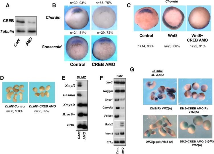 Fig. 2. Knockdown of CREB prevents the Spemann organizer function in mesoderm patterning. (A) CREB AMO was injected to embryos. DMZ explants were extracted at stage 15 and proteins were analyzed by Western blotting, using anti CREB and anti tubulin antibodies. (B) Embryos were injected with CREB AMO and cultured until gastrula (10.25). In situ hybridization was performed with probes to chordin and goosecoid. (C) CREB AMO was injected to one cell embryos. XWnt8 transcripts were injected to ventral blastomeres in four cell embryos. In situ hybridization was performed with a probe to chordin. (D) Embryos were injected with CREB AMO. DLMZ explants (n = 36) were dissected at stage 10.25 and cultured until sibling embryos reached stage 15. Control explants were dissected from uninjected embryos. (E) DLMZ explants (n = 18) were treated as described in panel D. Total RNA was isolated. RT-PCR analysis was performed. (F) DMZ explants were dissected at stage 10.25 from control embryos and embryos injected with CREB AMO. Total RNA was isolated and RT-PCR analysis was performed. (G) Upper panel: Pigmented embryos (P) were injected with CREB AMO. DMZ explants were isolated and conjugated with VMZ explants from albino embryos (A). Conjugates were grown to stage 15 and in situ hybridization was performed with a probe to muscle actin. Lower panel: Albino embryos were injected with transcripts encoding β-gal, without or with CREB AMO. DMZ explants from these embryos were conjugated with VMZ explants from untreated albino embryos. Conjugates were grown to stage 15 and in situ hybridization was performed with a probe to muscle actin. Light blue corresponds to β-gal; Dark blue corresponds to muscle actin staining.