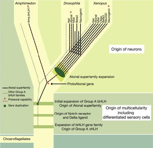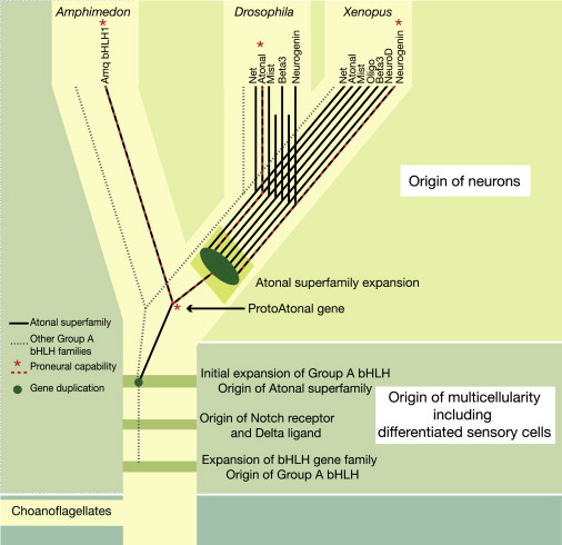 Figure 3. Summary Diagram Mapping the Evolution of the bHLH Gene Family with the Evolution of Neurogenic Circuitry and Neural Morphology in the MetazoaChoanoflagellates diverged from the Metazoa prior to the emergence of Notch and Delta genes, and the expansion of the bHLH gene family in the metazoan lineage [33]. Subsequently, in the metazoan stem lineage, multicellularity was acquired, and we propose that this state also included differentiated sensory cells. An initial expansion of group A bHLH genes occurred before the poriferan divergence, but the major expansion of this family occurred later, in the Eumetazoa. There is no evidence of neurons in the Porifera; however, the Amphimedon gene AmqbHLH has proneural capability comparable to that of Atonal superfamily genes in bilaterians. We propose that proneural capability was possessed by the last common ancestor of the Atonal superfamily (the âProtoAtonalâ gene), and that this capability was inherited by AmqbHLH as well as by certain bilaterian descendents.