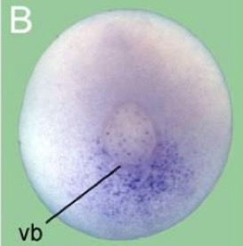 bmper (BMP binding endothelial regulator) gene expression in Xenopus laevis embryo, assayed via in situ hybridization, NF stage 12, vegetal/blastoporal view, dorsal up. Key: vb= ventral blastopre region |