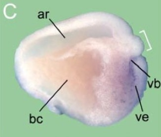 bmper (BMP binding endothelial regulator) gene expression in a hemisected Xenopus laevis embryo, assayed via in situ hybridization, NF stage 17-18, anterior left, dorsal up. Key: vb= ventral/lower blastopre lip, ve= ventral endoderm, bc= blastocoel; ar= archenteron. |