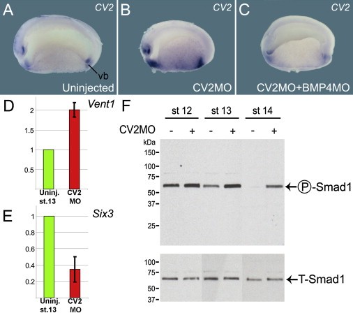 Figure 1. CV2 Is a Secreted BMP Feedback Inhibitor(A) Normal CV2 expression at stage 22 (hemisection). vb, ventral blastopore.(B) CV2MO microinjection increases CV2 expression.(C) The CV2 negative feedback loop requires BMP4. For each experimental sample, at least 25 embryos were examined, with similar results.(D) qRT-PCR showing increased expression of the ventral marker Vent1 in CV2-depleted embryos.(E) CV2 depletion reduces expression of the dorsal/forebrain marker Six3.(F) Endogenous Smad1 phosphorylation is increased by CV2 depletion at gastrula and neurula stages 12, 13, and 14. A pSmad1 signal was detectable in the stage 14 uninjected lane upon longer exposure. Total Smad1 antibody (T-Smad1) staining was used as loading control. |