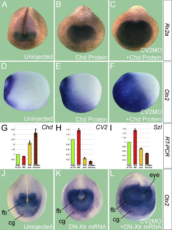 Figure 6. The Pro-BMP Function of CV2 Is Revealed in Epistatic Experiments with Chordin or Tolloid(A) Expression of the eye field marker Rx2a in uninjected Xenopus late neurula embryo (n = 45), anterior view.(B) Chordin protein injection (2 μM, 60 nl) into the blastocoele at late blastula (stage 9.5) caused dorsalization and an increase in Rx2a expression (n = 54).(C) CV2-depleted hosts were more sensitive to the anti-BMP effects of Chordin, as indicated by the expansion in the Rx2a domain (n = 48).(D) Uninjected early neurula (stage 13, side view) showing Otx2 expression in the future forebrain and midbrain regions (n = 19).(E) Chordin protein injection expands Otx2 in wild-type embryos (n = 25).(F) CV2 depletion sensitizes the embryo to the effects of Chordin on Otx2 (n = 23). Note that the border of Otx2 expression expands posteriorly.(GâI) qRT-PCR analysis of the D-V markers Chd, CV2, and Szl after Chordin protein injection into wild-type and CV2-depleted embryos at late blastula. The bars indicate standard deviation between two groups of seven embryos each.(J and K) Anterior views of uninjected control or embryo microinjected four times with 250 pg of DN-Xlr mRNA, which inhibits the proteolytic degradation of Chordin. Note that the Otx2-positive forebrain (fb), midbrain, and cement gland (cg) regions are expanded, consistent with the anti-BMP effects of Tolloid inhibition (n = 27).(L) In CV2-depleted embryos, Otx2 expression is greatly expanded by DN-Xlr mRNA (n = 27). The dotted line indicates the eye field (eye), which is more weakly stained by Otx2. |