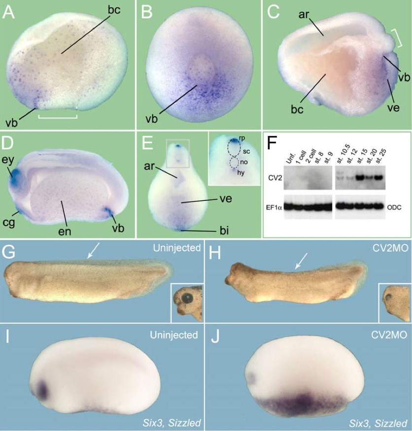 Figure S1. CV2 mRNA Is Expressed in Regions of High BMP and Its Depletion Ventralizes Xenopus Embryos. The expression pattern of CV2 in Xenopus embryos has not been previously reported. CV2 was expressed in all three embryonic layers, ectoderm, mesoderm, and endoderm in domains overlapping with those of BMP4 expression [Fainsod, A, Steinbeisser, H., and De Robertis, E.M. (1994). EMBO J. 13, 5015-5025]. At later stages, CV2 expression was detected in other regions of high BMP signaling such as the dorsal region of the eye and the cement gland, the roof plate, the hypochord, and blood islands. Before gastrulation, CV2 transcripts were undetectable by in situ hybridization or RT-PCR. (A) In a hemisected mid-gastrula stage embryo, CV2 is expressed in broadly in ventral regions. Bracket marks the blastopore. (B) At late gastrula, CV2 expression concentrates around the ventral blastopore. (C) In a neurula stage hemisected embryo, CV2 expression is seen in the ventral endoderm around the blastopore marked by bracket. (D) CV2 expression is turned on in the dorsal eye, the cement gland and is still present in the ventral endoderm in hemisected tadpoles. (E) CV2 is expressed in high BMP regions both in the ventral and the dorsal side of transversely sectioned embryos. Inset shows CV2 expressed in the roof plate of the spinal cord and in the hypochord. (F) RT-PCR analysis indicates CV2 expression is zygotic, starts at gastrula, and reaches its maximum at neurula stage. (G) Stage 32 uninjected embryo (inset shows stage 40). (H) The CV2MO injected embryo shows a reduced head and dorsal (white arrow) and ventral fins and a strikingly smaller eye (inset). (I) Uninjected embryo stained with eye marker Six3 and the ventral BMP signaling marker Sizzled. (J) CV2 depletion reduces the eye marker Six3 and increases ventral BMP signaling marked by Sizzled. bc, blastocoele; vb, ventral blastopore; ve, ventral endoderm; ar, archenteron; ey, eye; cg, cement gland; bi, blood island; rp, roof plate; sc, spinal cord; no, notochord; hy, hypochord |