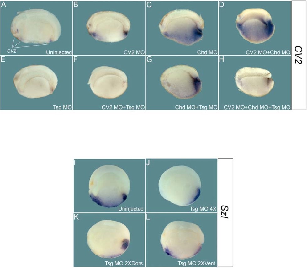 Figure S5. Tsg Functions as a Potent Pro-BMP Agent in the Absence of CV2 and/or Chordin. (A) In situ hybridization of hemisected embryo stained with CV2; uninjected stage 22 embryo. CV2 transcripts are used in this experiment as a reporter for BMP activity. (B) Upregulation of CV2 expression after CV2 MO injection. (C) Chordin depletion results in an expansion of CV2 expression domain. (D) A cooperative effect is observed after co-injection of CV2 MO and Chd MO. (E) Depletion of Tsg alone resembles wild-type embryos or slightly decreases BMP signaling. The same Tsg oligomer as in Blitz et al. (2003) was used in these experiments. (F) Tsg depletion completely erased the expression of CV2 in CV2 MO injected embryos. (G) Tsg knockdown reduced the CV2 expression domain in the Chd MO injected embryos. (H) Tsg is required (pro-BMP effect) for the striking increase in the expression of CV2 observed in CV2 MO and Chd MO injected embryos. (I-L) Effects of Tsg MO alone using Sizzled as the BMP signaling readout. Injection of Tsg MO into each cell at 4-cell stage consistently decreased Szl (n=25) when compared to uninjected stage 19 embryos (n=23). This is in agreement with findings in zebrafish with Tsg MO (Little and Mullins, 2004; Xie and Fisher, 2005). Microinjection of Tsg MO into the two dorsal blastomeres of embryos with clear D-V polarity inhibited dorsal Szl but increased its expression on the ventral side (n=24). This phenotype is probably caused by the inhibition of Chd protein function, which requires Tsg, and is consistent with phenotypes reported by Blitz et al. (2003). The depletion of Tsg in the two ventral blastomeres decreased Szl expression on the ventro- posterior region, but did not affect Szl expression in the anterior domain, which derives from non-injected cells (n=21). Differences in the phenotypes of dorsal and ventral injections of Tsg MO in Xenopus have been reported previously (Blitz et al., 2003). We propose that these D-V differences can be explained if dorsal depletion of Tsg caused predominantly defects in the function of Chordin, and ventral depletion reflected predominantly the requirement of Tsg for proper CV2 and BMP function. The most striking effect in this figure is seen by comparing the embryos in panels D and H, which are reproduced in the main text (Figure 3A and 3B). When both CV2 and Chordin are depleted, BMP signaling strongly requires Tsg. It is known that Tsg binds to BMP on its own right (OelgeschlaÌger et al., 2000) and that its presence does not affect significantly the binding of BMP to its receptors (LarraiÌn et al., 2001). Tsg may have a permissive function in BMP signaling, perhaps helping maintain BMP ligands in a soluble state in the extracellular space. |