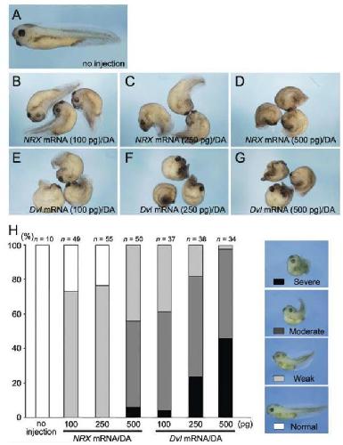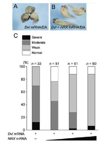 NRX or Dvl mRNA injection. Representative embryos with “severe”, “moderate”, “weak” and “normal” phenotypes are also shown.