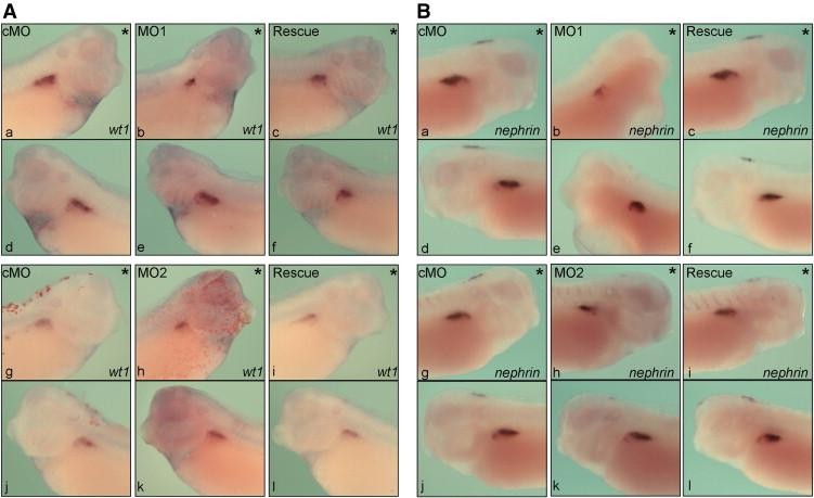 Fig. 2. lmx1b MO1 and MO2 prevent full size glomus formation. (A) lmx1b MO1 (panels b, e) or MO2 (panels h and k) was injected into the V2 blastomere at the 8-cell stage. All injections were carried out using a lineage tracer, either GFP (panels aâf) or LacZ (panels gâl). The size of the glomus was assessed by wt1 in situ hybridisation at stage 35/36. Injection of cMO does not induce any phenotype on the injected side (compare panels a to d and g to j). lmx1b MO1 injected embryos (5 ng) showed a reduced glomus (compare panel b to e). A similar phenotype was observed following the injection of lmx1b MO2 (10 ng) (compare panels h to k). Injection of lmx1b-mut mRNA (2.5 ng) can partially rescue the phenotype of MO1 (panels c and f) and MO2 (panels i and l). The injected side is marked with an asterisk. (B) lmx1b MO1 (panels b, e) or MO2 (panels h and k) was injected into one cell of 2-cell embryos. All injections were done using a lineage tracer, either GFP (panels aâf) or LacZ (panels gâl). The size of the glomus was assessed by nephrin in situ hybridisation at stage 33/34. Injection of cMO does not induce any phenotype on the injected side (compare panels a to d and g to j). lmx1b MO1 injected embryos (5 ng) showed a reduced nephrin-staining area on the injected side (compare panels b to e). A similar phenotype was observed following the injection of lmx1b MO2 (10 ng) (compare panels h to k). Injection of lmx1b-mut mRNA (2.5 ng) can partially rescue the phenotype of MO1 (panels c and f) and MO2 (panels i and l). The injected side is marked with an asterisk.